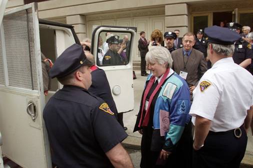 Right: The arrest. We all went in police vans; this is Bishops Susan Morrison