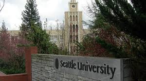 alt="a view of a tower on the Seattle university campus, framed by two tall evergreen trees, and in the foreground is a low gray stone wall with Seattle University on it in large letters"