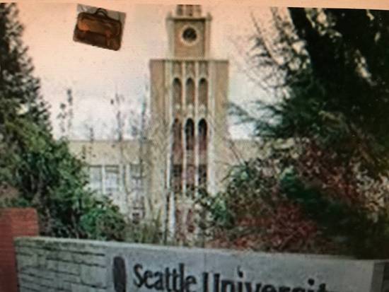 alt= A somewhat fuzzy version of the clear photo that is at the beginning of this post, of a tower on the Seattle University campus, framed by tall evergreen trees. But unlike the first photo, there is a briefcase flying through the air to the left of the tower.”